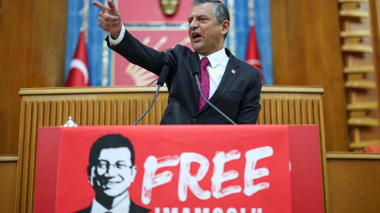 Ekrem İmamoğlu’nun fotoğraf, video ve ses içeren içeriklerine yasak getirildiğini anımsatan CHP lideri Özgür Özel, buna rağmen “Free İmamoğlu” pankartının Boğaz Köprüsü’ne asıldığını belirtti ve kürsüye aynı pankartı astı.