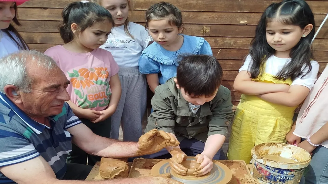 Minik öğrenciler, kendi elleriyle çamura şekil vererek ilk çömleklerini yapmanın heyecanını yaşadı.