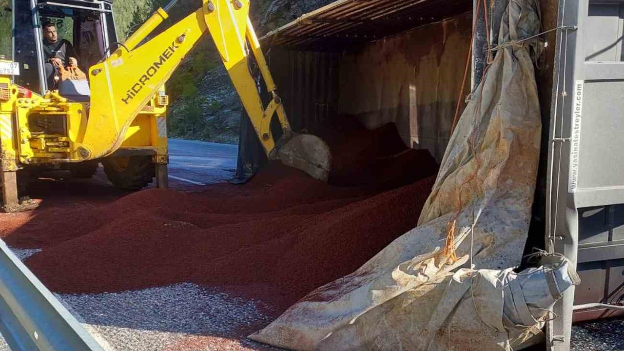 ANTALYA (İHA) - Antalya'nın Akseki ilçesinde peyzaj malzemesi yüklü tırın devrilmesi sonucu meydana gelen kazada sürücü yara almadan kurtuldu.