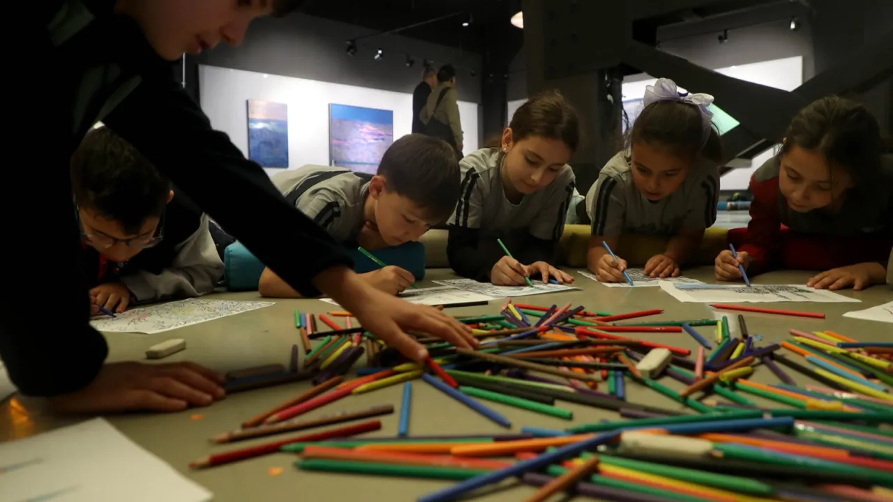 Sanatla iç içe olunması hedeflenen etkinlikte çocuklar, serginin ardından boyama yaparak resimler çizdi.