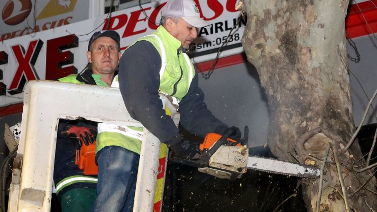 Özellikle şehrin sembol olan merkezi noktalarında yoğun bir gece mesaisi yürütülüyor. Park ve Bahçeler Dairesi Başkanlığı Çark Caddesi ve civar bölgesinde kuru ağaçlar, elektrik tellerine uzanan ağaç dalları keserek ağaçlara düzenli bir görüntüye kavuşturdu.