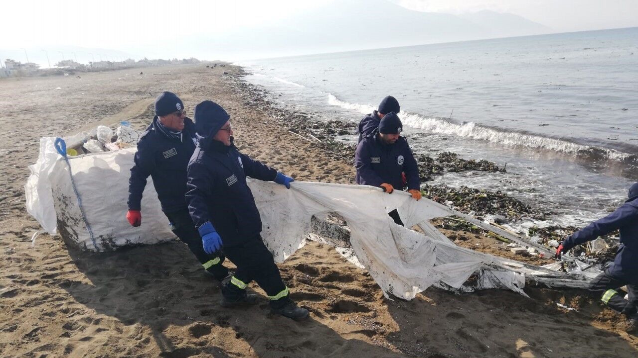 Hatay Büyükşehir Belediyesi ekiplerinin Samandağ ilçesi sahilinde yürüttüğü temizlik çalışmalarında torbalarca çöp toplandı.