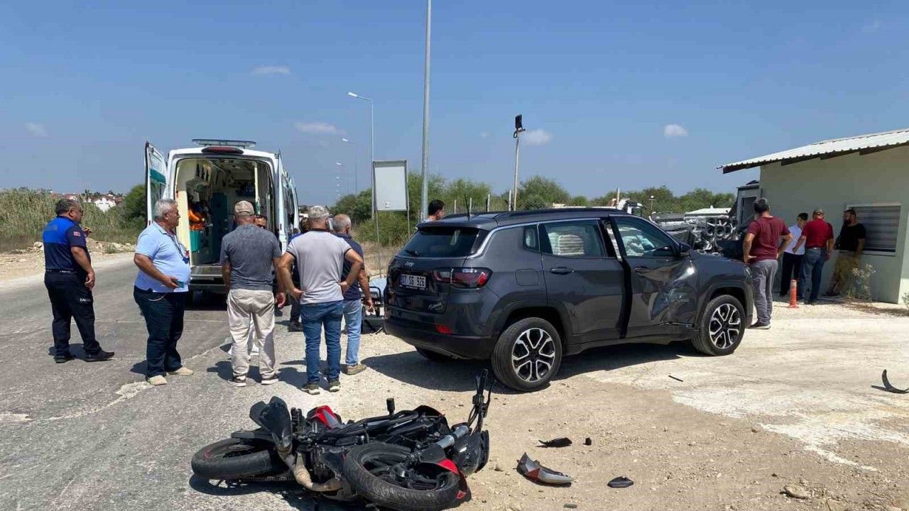 Antalya’nın Serik ilçesinde cip ile motosiklet çarpışması sonucu meydana gelen trafik kazasında motosiklet sürücüsü yaralandı.
