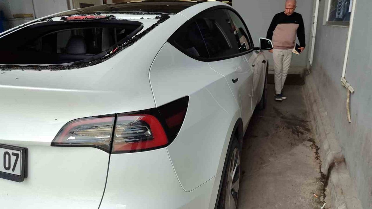 Antalya’nın Serik ilçesinde etkili olan dolu ve sağanak yağış, seralara ve araçlara zarar verdi. Dolu yağışı sırasında Tesla marka bir otomobilin camları kırıldı.