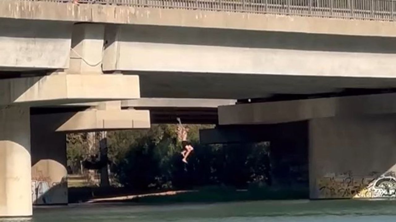Sıcaklığın 30 derece seviyelerinde seyrettiği Adana’da bazı gençler serinlemek için Seyhan Nehri’ne girdi. Serinlemek isteyen gençler canlarını hiçe sayarak otoyol köprüsüne çıkıp metrelerce yükseklikten kendilerini Seyhan Nehri’ne bıraktı. Nehre düştükten sonra kıyıya çıkmak isteyen gençlerin zorlandığı görüldü. Gençlerin tehlikeye aldırış etmeden birkaç kez köprüden nehre atlaması tehlikeye davetiye çıkardı. Her yıl onlarca kişinin boğulduğu Adana’da gençler buna rağmen yüzmeye devam etti.