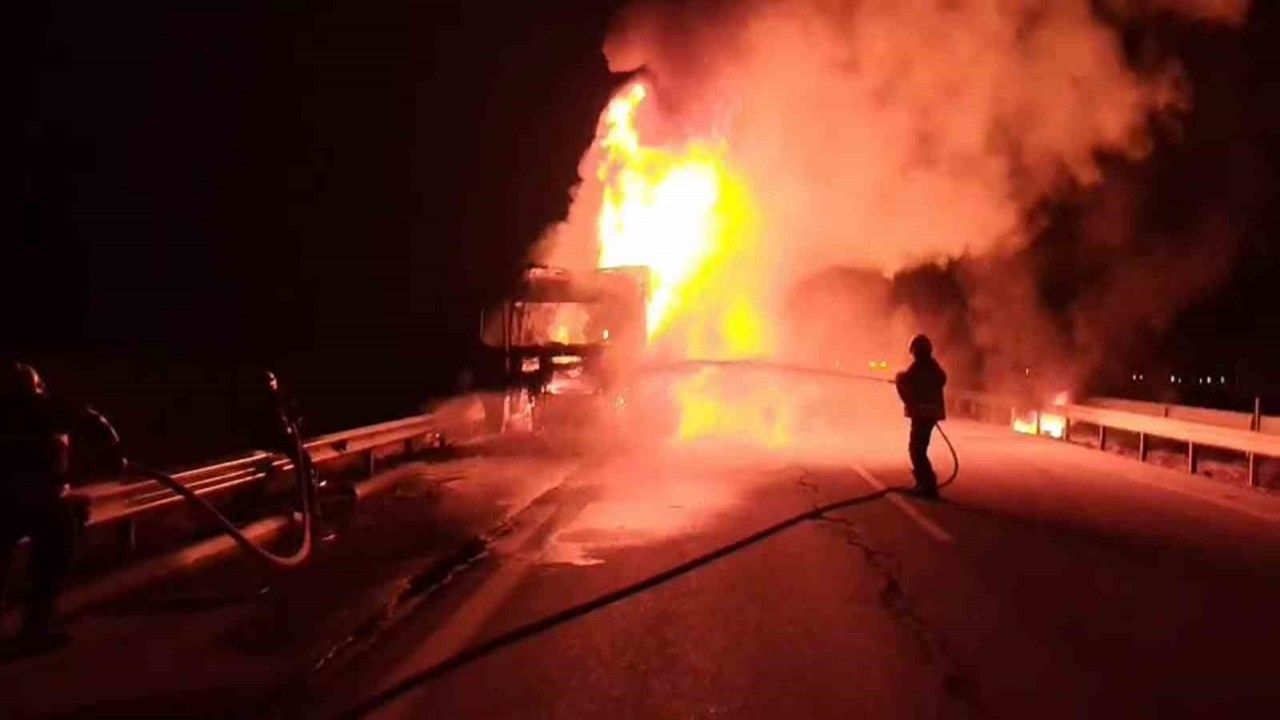 Hatay’da seyir halindeyken alevlere teslim olan tır yanarak kullanılmaz hale geldi.