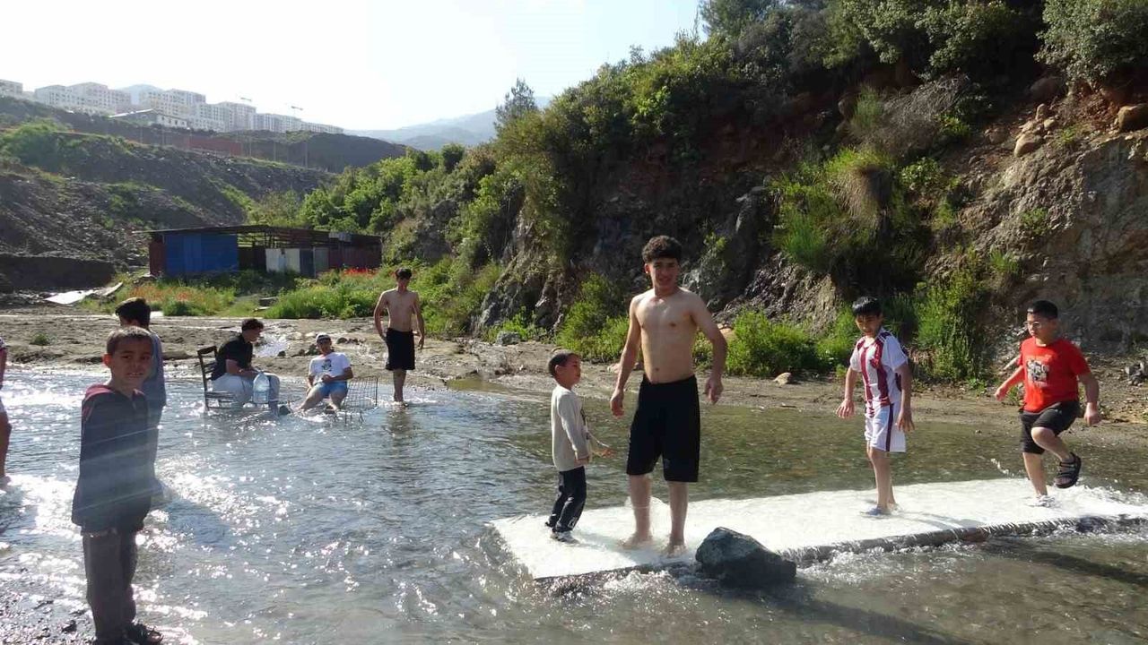 Hatay'da sıcak havadan bunalarak serinlemek isteyen çocuklar, derede yüzdüler.
