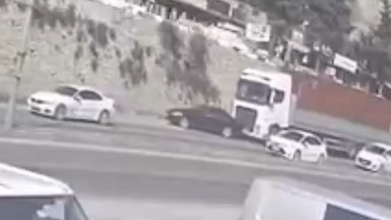 Hatay’da tır sürücüsünün önünde seyreden otomobili önüne alarak sürüklediği anlar güvenlik kamerasına yansıdı.