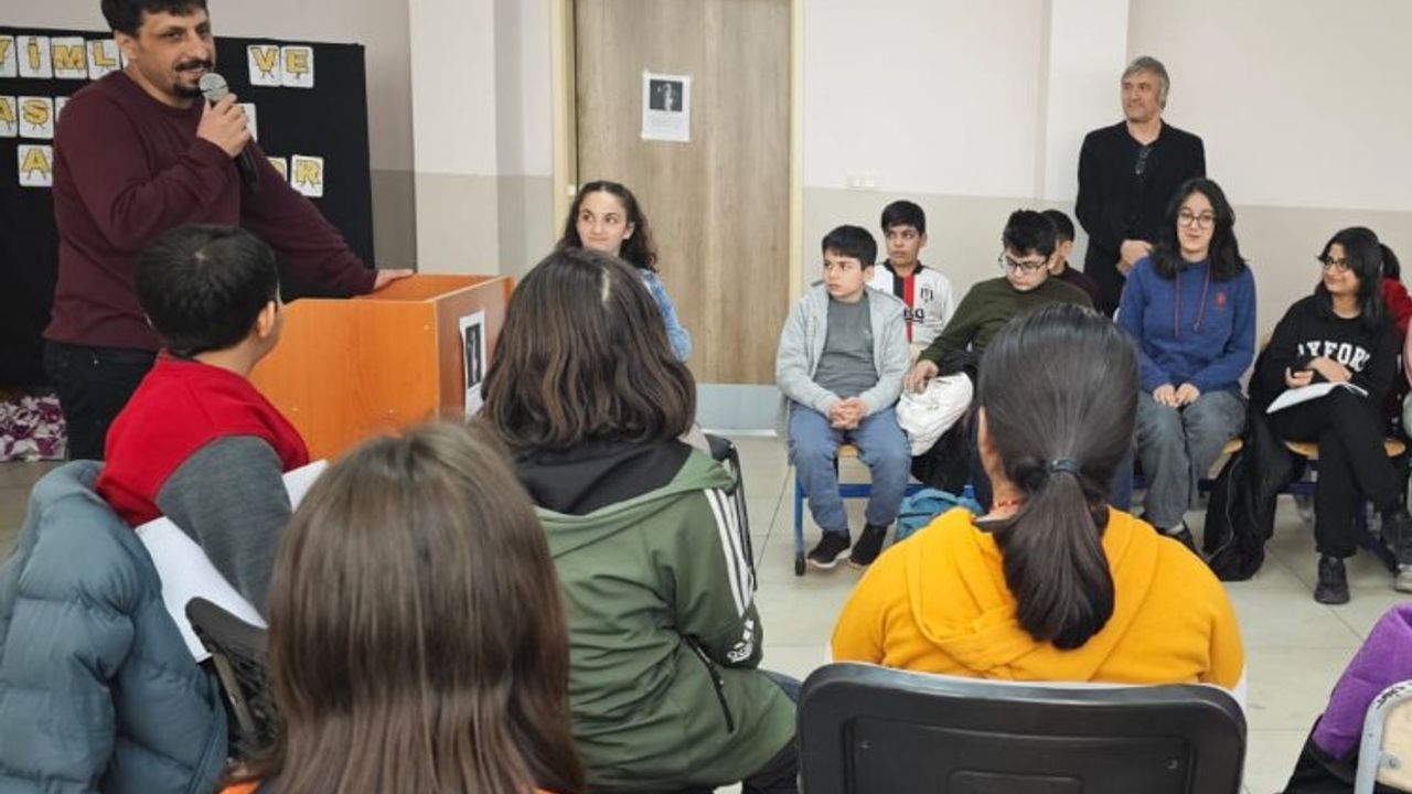 Tiyatro ve Drama Eğitmeni Gökmen Okdayan, Mardin/Artuklu Şehit İlhan Varank Ortaokulu “Yaratıcı Yazarlık Grubu” davetlisi olarak öğrencilerle bir araya geldi. Şehmus EDİS / MARDİN (İGFA) - Okulun Çok Amaçlı Salonu’nda, Şerife Olgaç ve Sermiyan Aydın isimli öğrencilerinin moderatörlüğünde yapılan “Çocuklar İçin Tiyatro” konulu söyleşiye öğrenci, öğretmen ve veliler yoğun ilgi gösterdi.