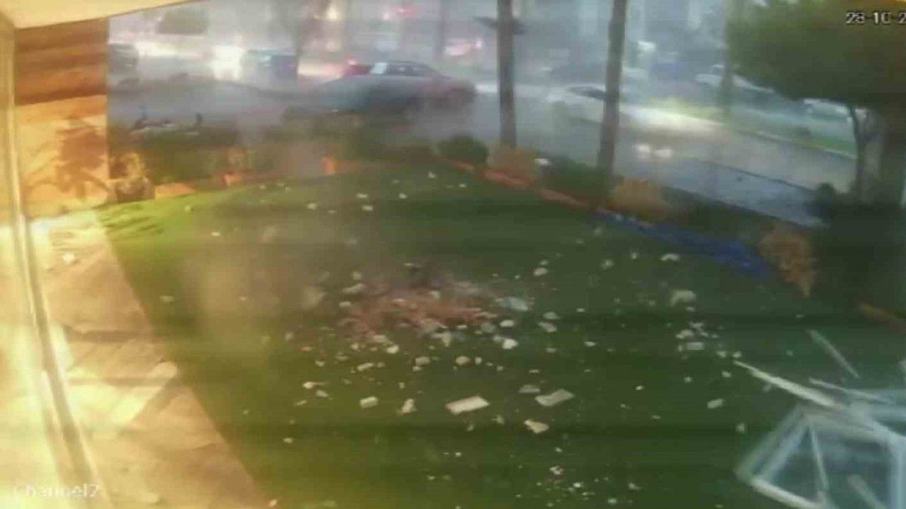 Antalya’da dün akşam saatlerinde yaşanan fırtınaya dayanamayarak yola uçan tonlarca ağırlığındaki çatının düşme anı güvenlik kamerasına yansıdı