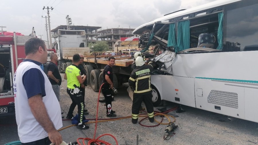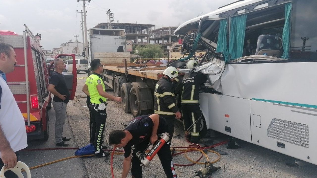 Kaza, bugün saat 16.30 sıralarında Manavgat ilçesi Ilıca Mahallesi'nde yaşandı. Edinilen bilgiye göre, Alanya'daki otellerden almış olduğu 33 Rus uyruklu turisti havalimanına götürmekte olan Nuri Okudan idaresindeki 07 BIC 869 plakalı tur midibüs, D-400 Karayolu Iılıca Mahallesi sınırları içinde yolun dışında park halindeki 07 GDK 46 çekici plaka, 07 AZK 83 dorse plakalı tıra arkadan çarptı. Midibüs sürücüsü Nuri Okudan araç ile tır dorse arasında sıkışıp hayatını kaybederken, Rus uyruklu 5 turist yaralı olarak Manavgat'taki çeşitli hastanelere kaldırıldı. İhbar üzerine olay yerine çok sayıda ambulans ve Antalya Büyükşehir belediyesi Manavgat İtfaiye birimi kurtarma ekibi yönlendirildi. Midibüsle dorse arasında sıkışan sürücü için ekipler midibüsün ön bölümü keserken, hafif şekilde yaralanan turistlerden bazıları ellerinde buz kalıplarıyla darbe alan yerlerine uygulama yaptı. Yara almadan kurtulan turistler, olay yerine çağrılan başka araçlarla yollarına devam etti.