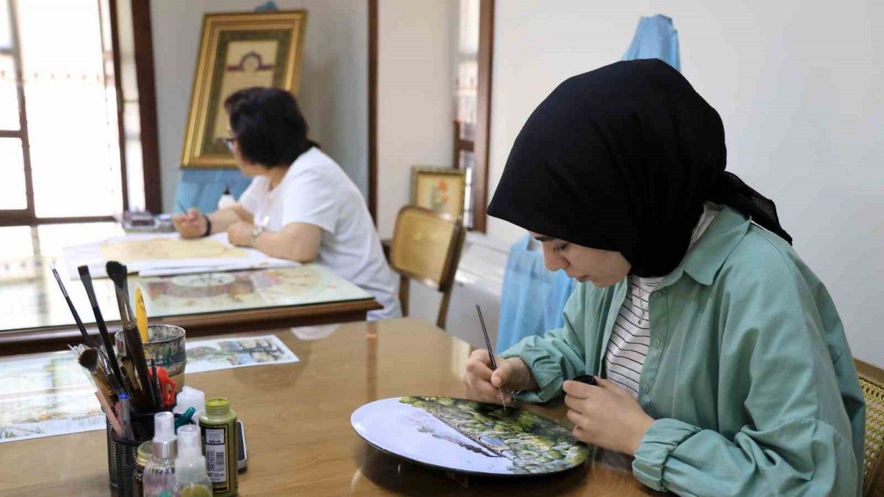 Usta öğreticiler tarafından el emeği göz nuru yapılan ürünler beğeni toplarken Sanat Tasarım Atölyesinde çeşitli teknikler kullanılarak yapılan eserler de dikkat çekiyor. Bu atölyede usta öğreticiler, resim, rölyef, hat ve tezhip sanatlarını birleştirerek çeşitli eserler yapıyor.