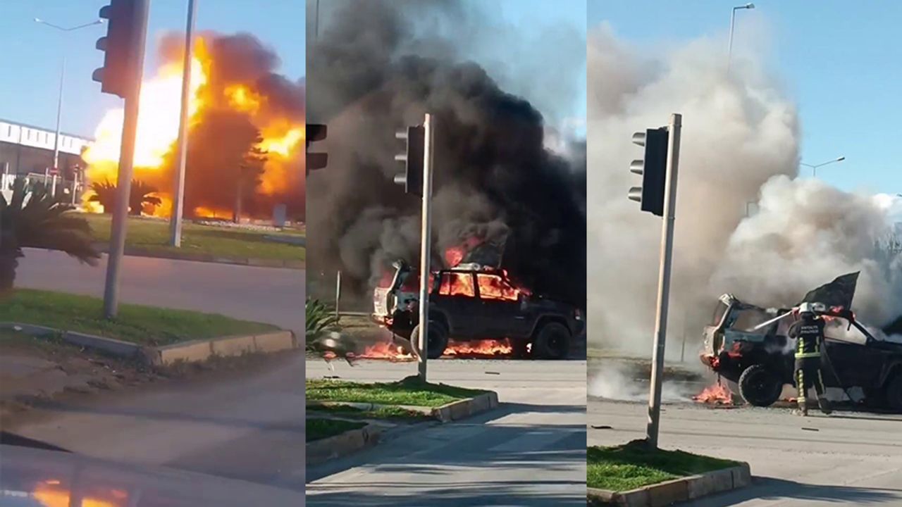 Antalya’da kavşak sisteminde biranda alev alan otomobilin patladığı anlar cep telefonu kamerasına yansıdı.