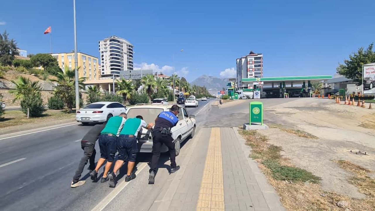 Mersin’de yakıtı biten otomobil yol ortasında kaldı. Vatandaşlar ve bir polis, aracı iterek akaryakıt istasyonuna ulaştırdı. O anlar ise bir vatandaş tarafından cep telefonuyla kaydedildi.