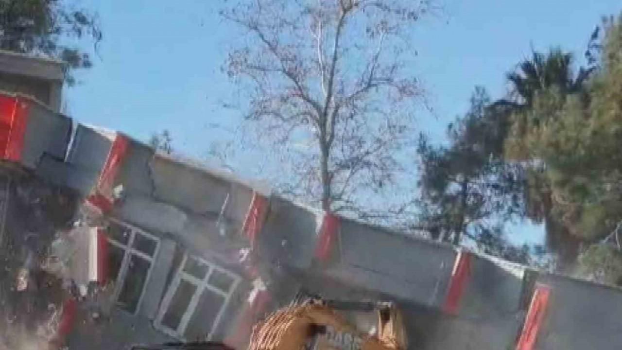 Depremin yerle bir ettiği Hatay’da hasarlı binaların yıkımında sona gelindi. Payas ilçesinde bulunan itfaiye amirliği binası da ekipler tarafından kontrollü olarak yıkıldı. Yıkım esnasında iş makinası, 2 katlı binanın altında kalmaktan son anda kurtuldu. Yaşanan panik anı ve operatörün hızlı manevrasıysa cep telefonu kamerasına yansıdı. Yıkım sonrası iş makinasında maddi hasar oluştu.