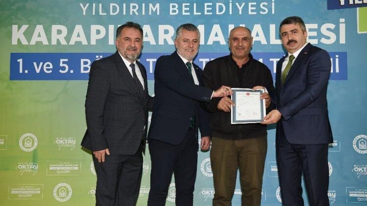 Yıldırım Belediyesi, Karapınar Mahallesinde bin 503 hak sahibine imar parseli tapularını teslim etti.BURSA (İGFA) - Yıldırım Belediyesi, Karapınar Mahallesi 1. Bölge Geri Dönüşüm ve İmar Uygulaması kapsamında, tapu çalışmalarını tamamlayarak bin 503 hak sahibine imar parseli tapularını teslim etti. Karapınar Gençlik Merkezi'nde düzenlenen tapu dağıtım törenine; Yıldırım Belediye Başkanı Oktay Yılmaz’ın yanı sıra Yıldırım İlçe Tapu Müdürü Enes Gezmiş, AK Parti Yıldırım İlçe Başkanı İrfan Akkaya, Büyükşehir Belediyesi Başkan Vekili Ali Mersin, AK Parti il yönetim kurulu üyeleri Fuat Alpaslan, Süheyla Bülbül ve Şahin Biba, Karapınar Mahalle Muhtarı Mehmet Çakır ve hak sahipleri katıldı.
