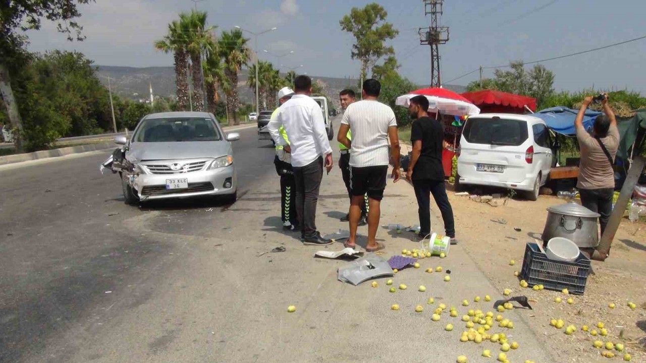 Mersin’in Silifke ilçesinde yol kenarında duran araca arkadan çarpan sürücü otomobilini bırakıp kaçtı. Kazaya karışan araçlardan biri çilek ve incir gibi yöresel ürünler satılan tezgaha girdi.
